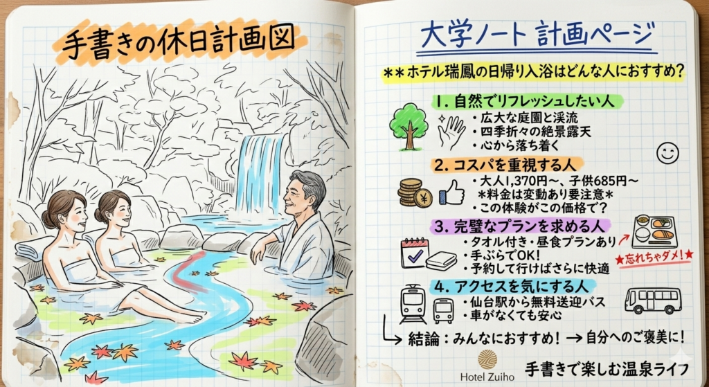30代は、仕事の責任も増え、休日も家の用事で終わりがち。だからこそ「移動がラクで、短時間でも満足できる癒し」が大事です。ホテル瑞鳳は仙台市内からアクセスしやすく、日帰りでもしっかり温泉リゾート気分を味わえます。