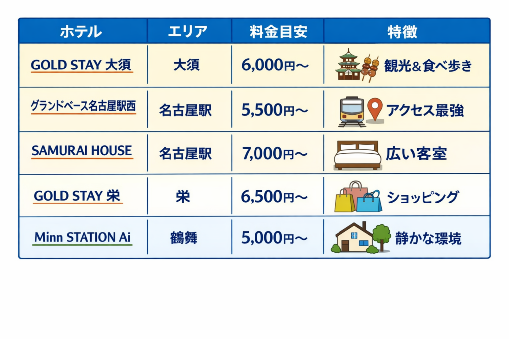 名古屋観光をゆったり楽しみたいカップルや、ホテル代と食費のバランスを考えながら旅行したい人にも相性の良いスタイルです。