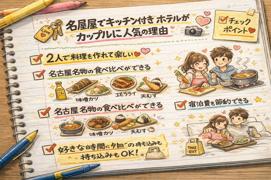 名古屋で節約しながら旅行を楽しみたいカップルには、キッチン付きホテルがとても相性の良い選択肢です。自炊を取り入れることで食費を抑えやすく、ホテルでもゆっくり過ごせるので、普通のホテル泊とは違った楽しみ方ができます。