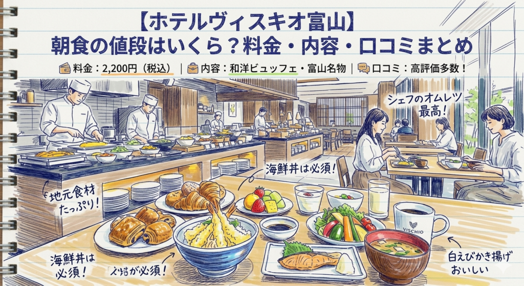 まず気になるのが、ホテルヴィスキオ富山の朝食料金です。旅行予約では「朝食付きプランにするべきか」「現地で追加したほうがいいのか」を迷う方も多いですが、事前に相場感を把握しておくと選びやすくなります。