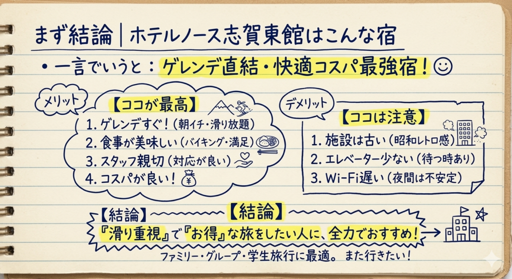 まとめ|ホテルノース志賀東館はコスパ重視の学生スキー旅行に向く